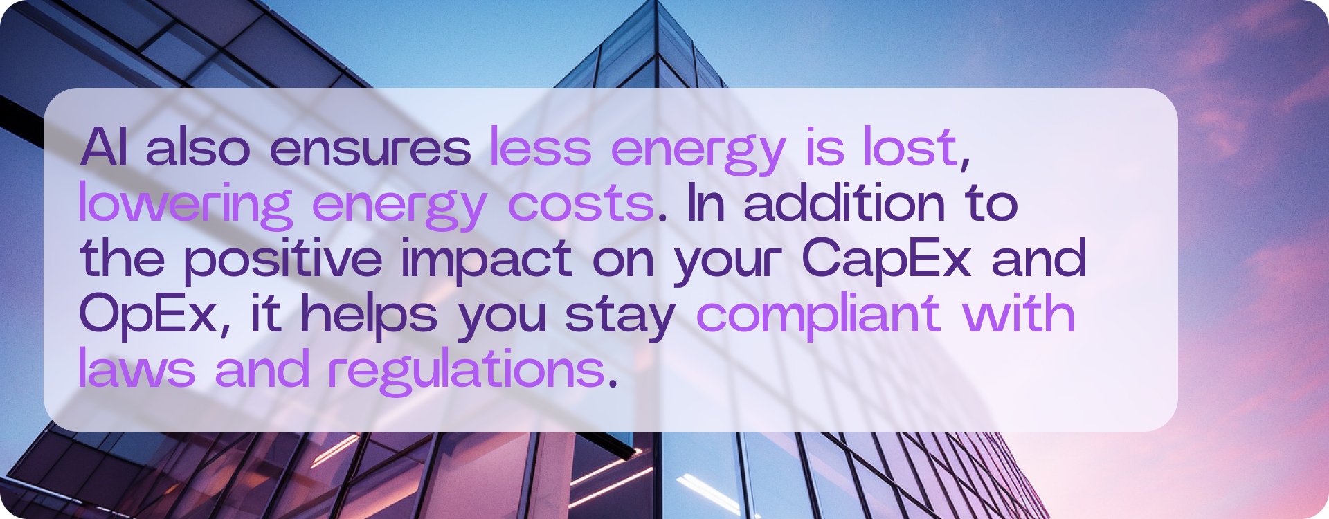 To continue on the particle of predictive maintenance. Thanks to those insights, AI also ensures less energy is lost, lowering energy costs. In addition to the positive impact on your CapEx and OpEx, it helps you stay compliant with laws and regulations.